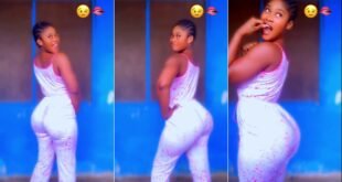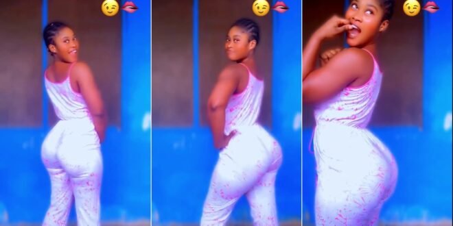 The bright blue background makes the pink and white outfit really pop. You have to see these moves for yourself in the full video.