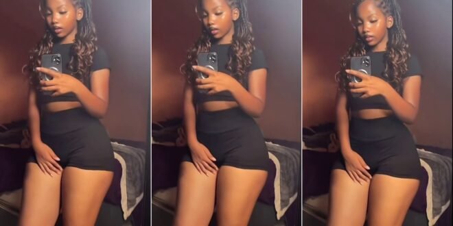 This quick mirror selfie captures the perfect mix of casual comfort and everyday confidence. She effortlessly shows off a sleek black two-piece in a cozy bedroom setting.
