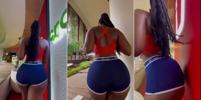 She’s rocking a bold red sports bra and cute blue athletic shorts. You have to see these moves for yourself, so watch the full video now!