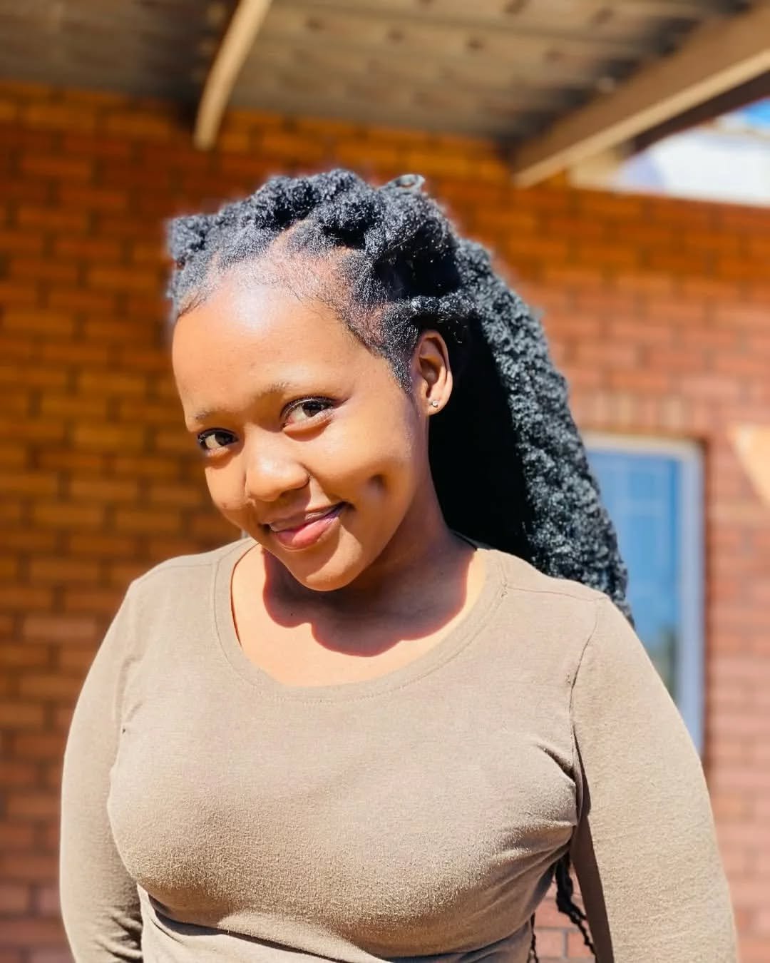 Check out this stunning look that perfectly blends comfort and style. She’s absolutely glowing against that classic brick backdrop.