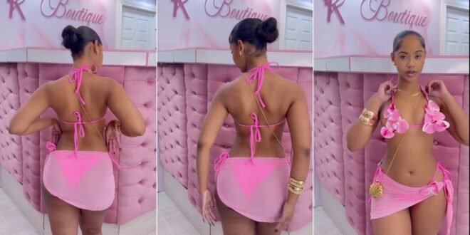 The look pairs a beautiful orchid-themed bikini with a breezy sheer wrap skirt and gold accents. Watch the full video to see this gorgeous outfit in action!