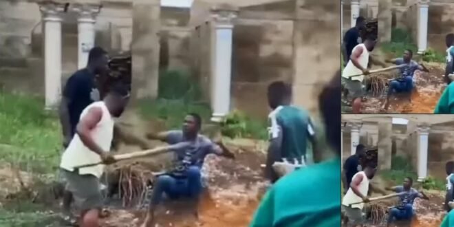 Desperate to evade his pursuers, the thief sought refuge inside a nearby uncompleted building. He didn’t realize that construction workers were already on-site and quickly spotted his hiding place. Once the workers apprehended him and handed him over to the crowd, the situation escalated as people used stones, sticks, and cutlasses to beat him.