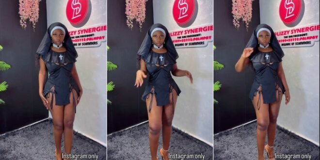 A provocative video is making waves online, featuring a young woman dancing in a reimagined nun’s habit. The short, black outfit leaves little to the imagination, contrasting sharply with traditional religious attire. Set against a backdrop of modern decor, including a shag rug and pink floral accents, the scene is both playful and visually striking. The video is clearly designed to grab attention.