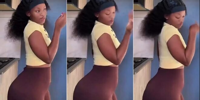 Dressed in a bright yellow top and brown leggings, she keeps the rhythm going against a cozy blue kitchen backdrop. Tap play now to watch the full routine and enjoy every smooth move.