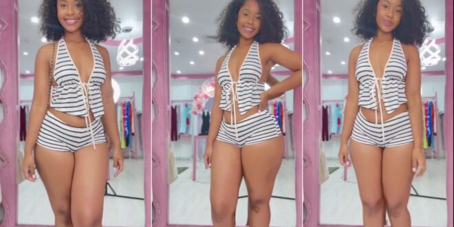 The matching halter top and shorts pair perfectly with a gold-chain bag and curly hair. Click play now to watch the full video and see this trendy outfit in action.
