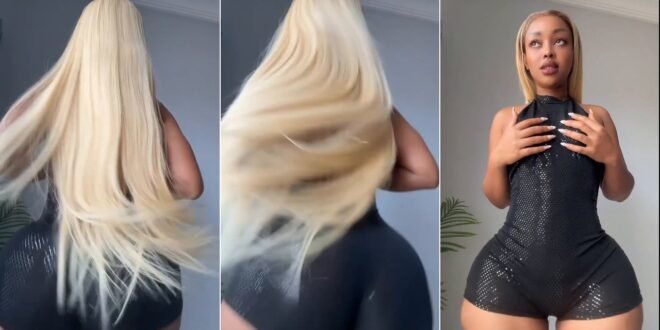 The scene quickly transitions into a dynamic display of motion and elegance as the model turns, allowing her long, straight blonde hair to cascade effortlessly down her back. A swift hair flip introduces a captivating blur effect, emphasizing the fluidity and confidence behind the presentation before she settles into a final pose. By keeping her back to the lens, the footage beautifully draws attention to the impeccable tailoring of the romper and the seamless harmony of hair and fabric. Experience the full visual journey by watching the complete video now.
