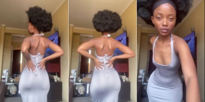 Watch how a sleek light grey halter dress instantly transforms a cozy living room into a personal runway. This look proves that clean lines and soft fabrics can easily make a bold everyday statement.
