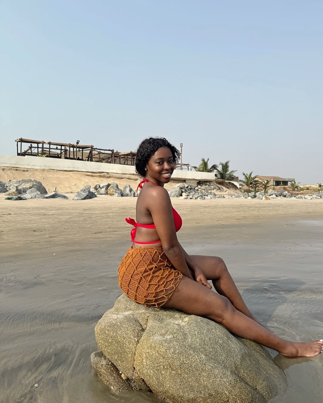 From the vibrant red top to the crochet skirt, every detail pops against the blue sky. Check out the full video to see the magic happen.