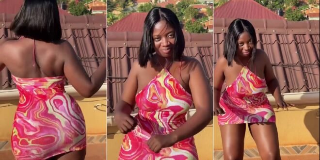 She looks amazing in a bold, multi-colored dress against a beautiful backdrop of red roofs. Watch the full video to see her playful moves!