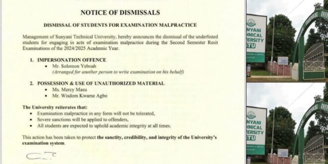 Academic integrity is the backbone of any higher education institution, but for three students at Sunyani Technical University, a shortcut led to a permanent exit. The university recently announced the dismissal of these individuals following discoveries of cheating during the second-semester resit examinations for the 2024/2025 academic year. It’s a stark reminder that the cost of academic dishonesty can be far higher than the effort required to study.